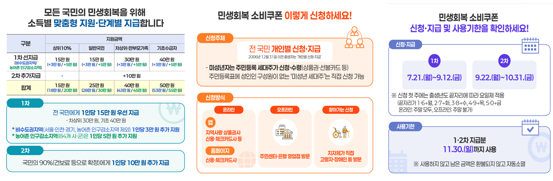‘민생회복 소비쿠폰’은 정부가 소비 진작 및 소상공인·자영업자 지원을 목적으로 발행하는 할인 및 캐시백 형태의 소비 지원 정책입니다. 주로 전통시장, 중소형마트, 문화·체육·여행 분야에서 사용할 수 있도록 제공되며, 국민 생활과 밀접한 업종 위주로 적용됩니다.